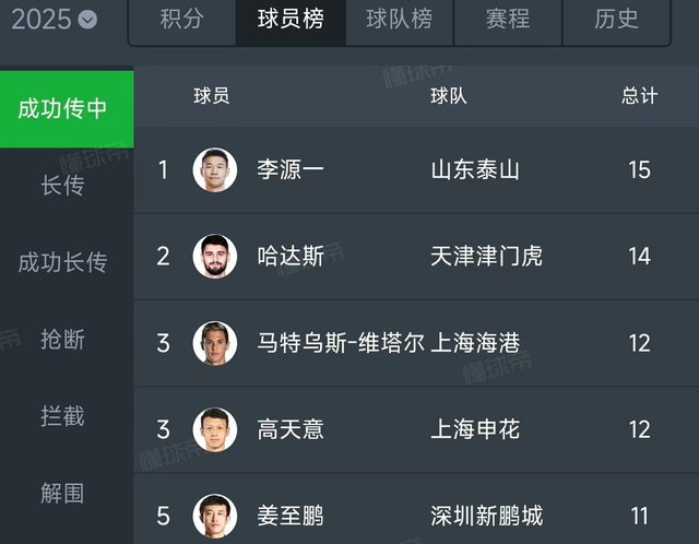 第一个,李源一现在绝对是中超顶级水平的球员了。他现在已经有5次助攻,高居助攻榜第一,另外,在成功传中榜上也是第一,他贡献了整整15次成功传中,也就是说,平均每场比赛都至少有3次传中能准确找到队友,超越了所有外援!